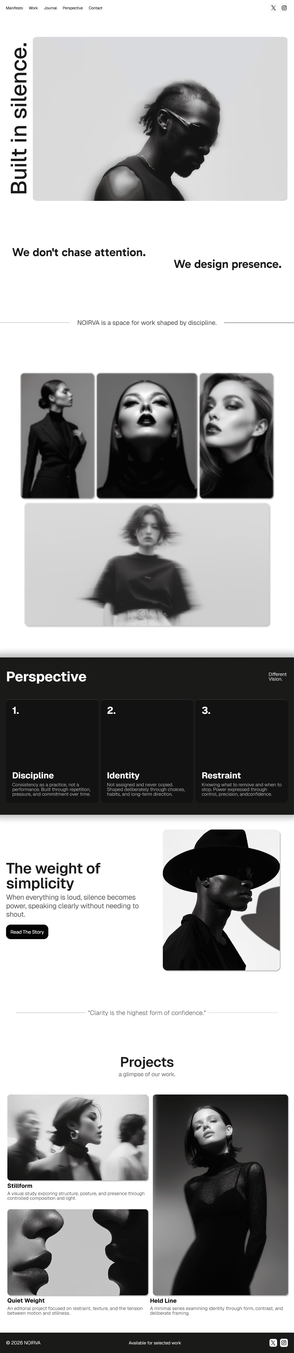 Noirva is a conceptual editorial brand focused on discipline, restraint, and visual presence. The goal was to design a digital space that values silence, structure, and intentional expression over noise and trends.